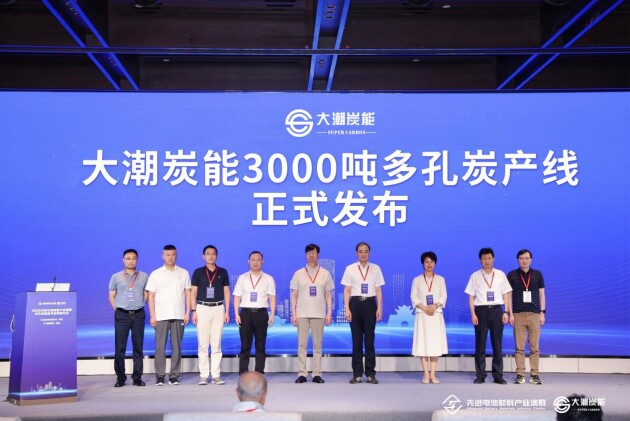 随后,河南省大潮炭能科技有限公司重磅发布3000吨多孔炭分娩线。蒋剑春盘问员、雷廷宙盘问员、李宝华锻练、周一君总司理、张云鹤董事长、程凌总监,以及大潮炭能董事长李常利、总司理王利共同驱动发布典礼。该分娩线的发布具有里程碑兴味,将灵验鼓励储能碳材料领域的技能向上和产业升级。
